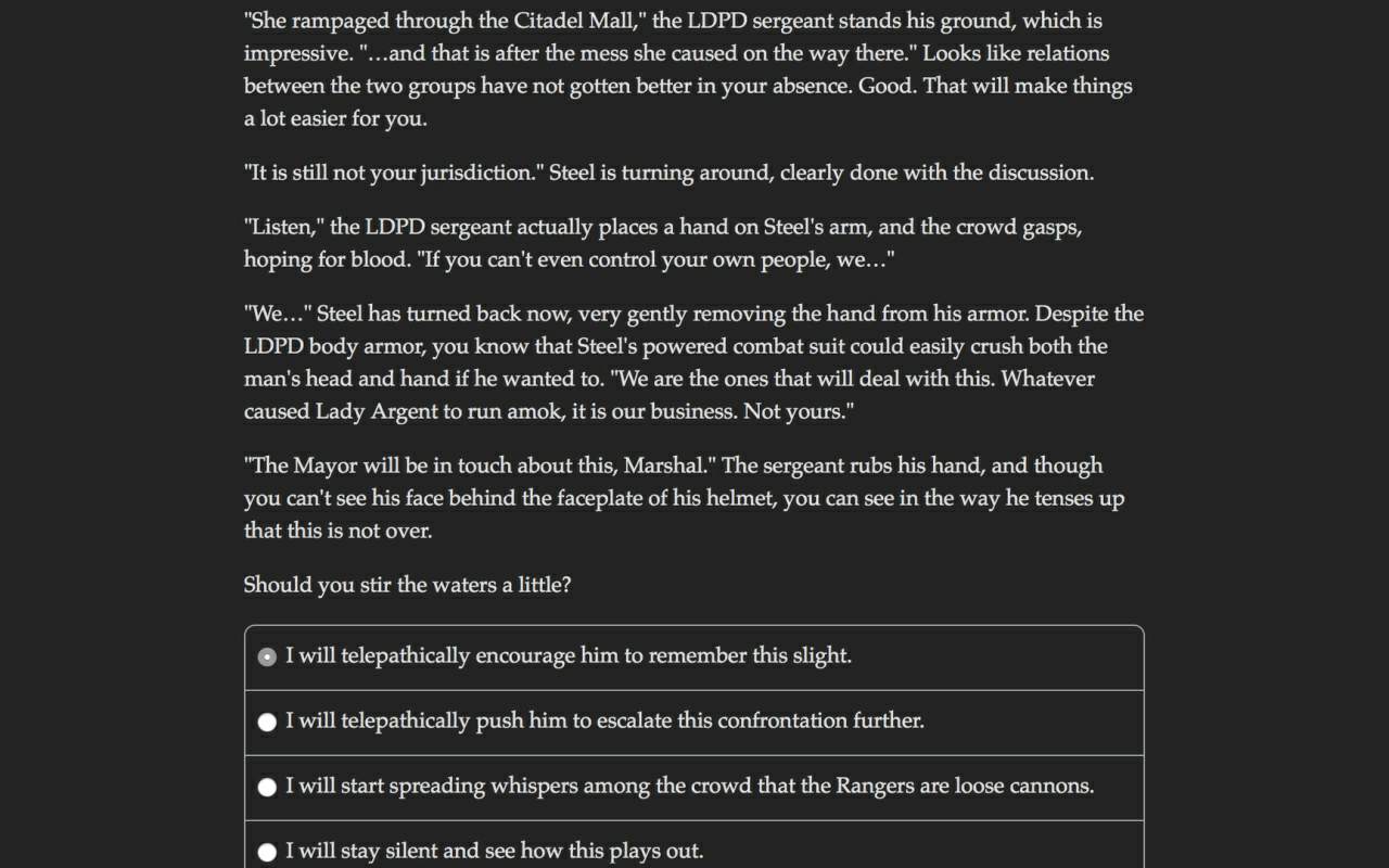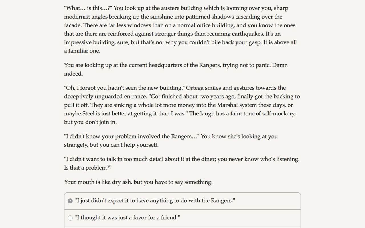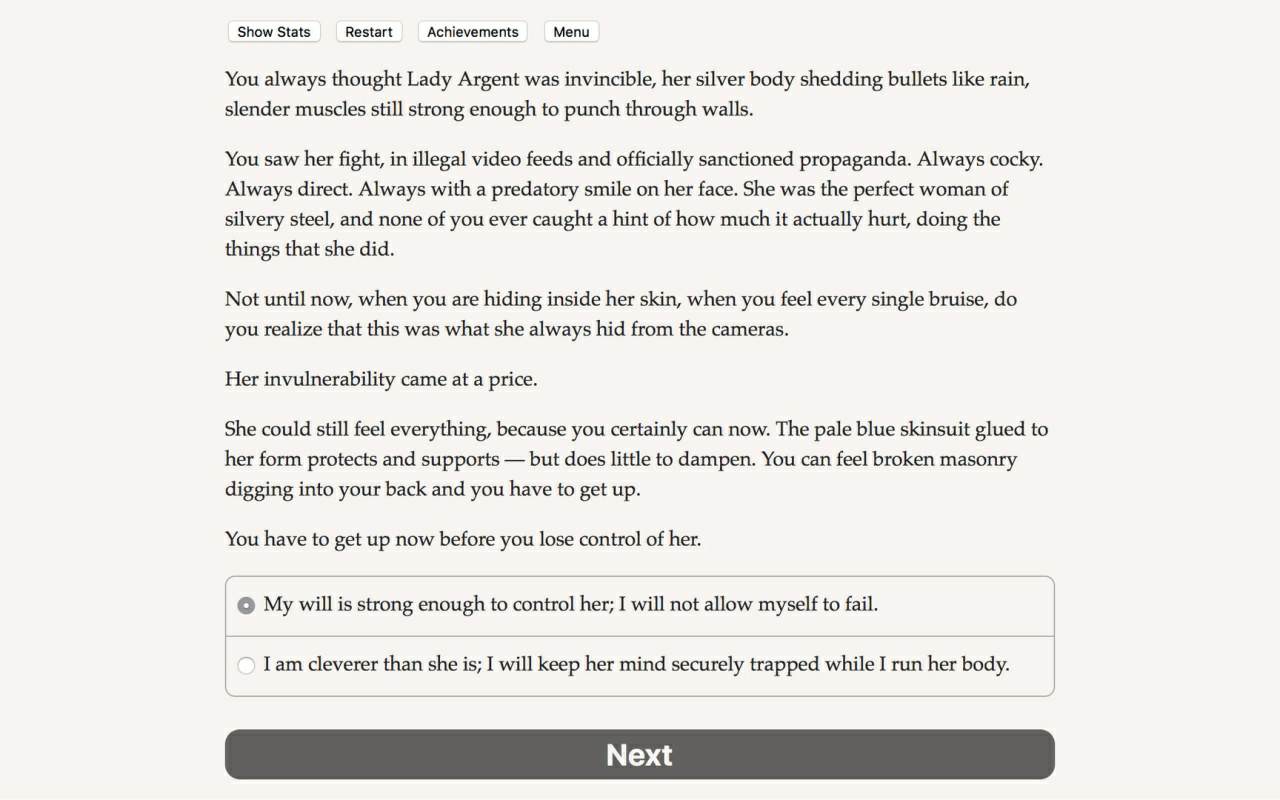 Жанр: Приключения, Инди, RPG Разработчик: Hosted Games Интерфейс: Английский Озвучка: Отсутствует Таблэтка: не требуется Fallen Hero: Rebirth - своеобразный подарок для всех любителей классических текстовых игр, где основу всего составляет личная фантазия игрока. Никакой графики и никаких привычных элементов геймплея - только огромное количество великолепно прописанного текста, формирующего перед игроками нетривиальный сюжет со множеством возможных "веток". Приготовьтесь вжиться в образ таинственного телепата, научитесь проникать в чужие умы, возьмите под контроль физическое тело своих противников, а также погрузитесь во внутренний мир самых разных личностей, которые сыграют первостепенную роль в вашей собственной истории! Системные требования: