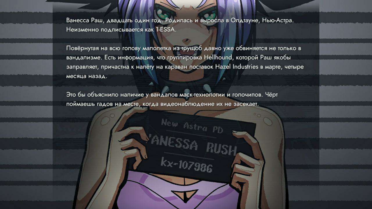 Жанр: Визуальная новелла, Аниме Разработчик: Sky Seekers Интерфейс: Русский Озвучка: Отсутствует [Субтитры на Русском] Таблетка: Не требуется Фантастическая визуальная новелла, представленная в невероятно стильной неоновой обёртке. На этот раз, центральным местом действия выступает обширный футуристический мегаполис под названием Нью Астра, который, как водится по заветам классических антиутопий, оказался во власти крупных деспотичных корпораций. Как следствие, в "VIOLENT RUSH" игрокам предстоит вжиться в роль самых настоящих уличных бунтарей, возглавляемых безбашенной молодой девицей по имени Ванесса. Желая покончить с происками бесчеловечного режима, главные герои объединяются в полноценную банду, которая специализируется на граффити и всему что с ним связано! Системные требования: